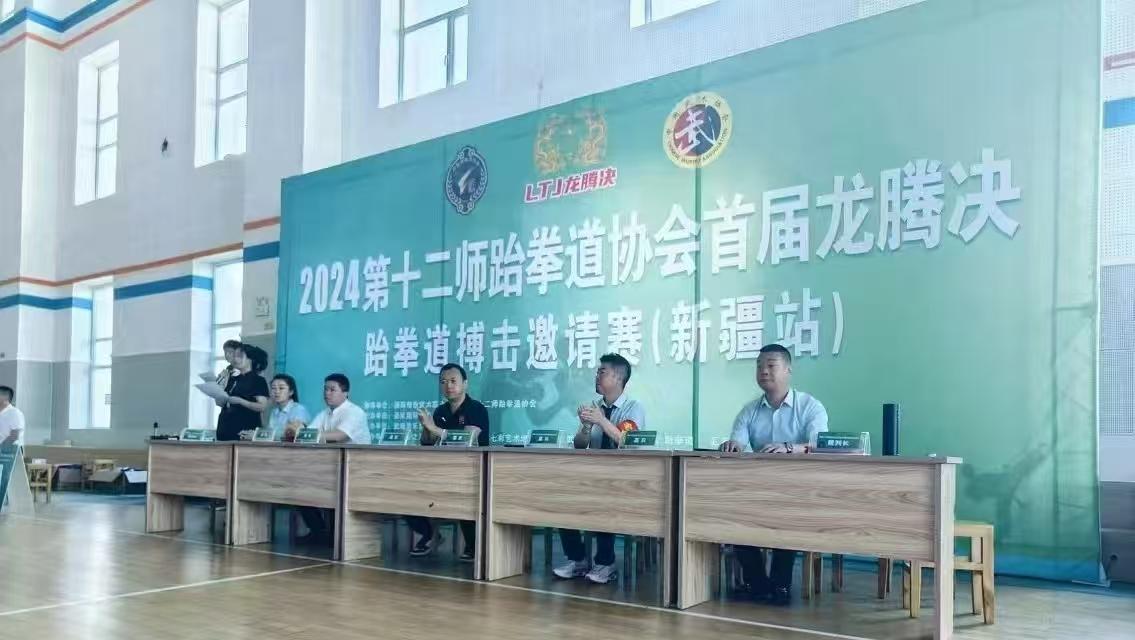 8月16日,由国际传统武术联合会,第十二师跆拳道协会指导,圣武国际健身中心主办、武魂俱乐部、 明睿文化推广中心承办,阜康七彩艺术培训学校、艺武馆、悟者武道、枫林隼之翼青少年俱乐部、智才跆拳道、汇友跆拳道、库尔勒博洋武道、库尔勒市龙威武道搏击俱乐部、五家渠龙卷风跆拳道、黑鲨格斗、闪电格斗协办,中华联合保险第十二师分公司、新疆天山吉缘有限公司赞助的2024年第十二师跆拳道协会首届龙腾决跆拳道搏击邀请赛在第十二师文体中心体育馆隆重举行。来自全疆各地的12个参赛单位,共计260余名选手齐聚一堂,展开了一场激烈的跆拳道和搏击对决。